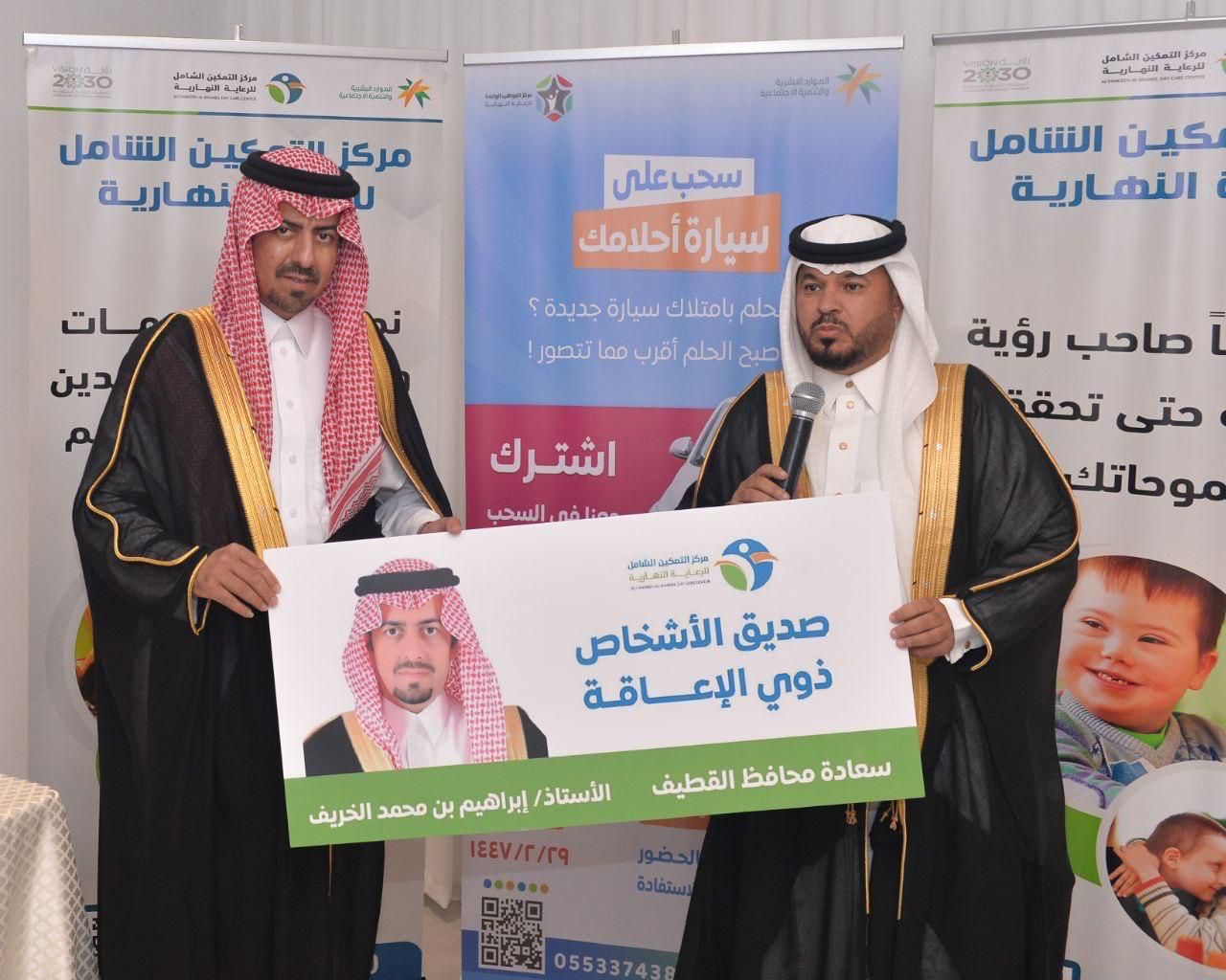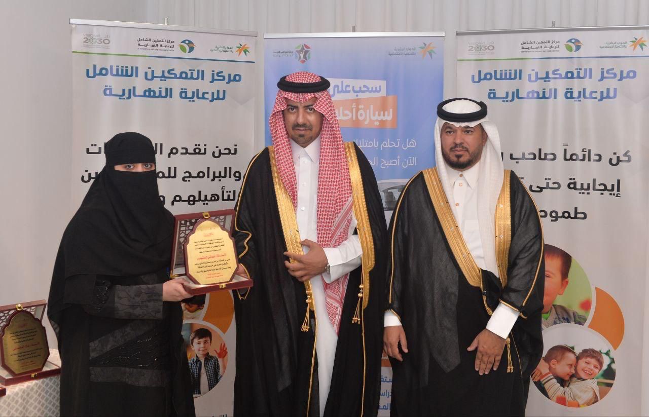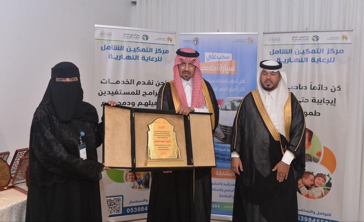وشهد الحفل عرضًا مرئيًا عن خدمات المركز وأهدافه، أعقبه تكريم عدد من الشخصيات على إسهاماتهم المتميزة في خدمة الأشخاص ذوي الإعاقة، وتقديم الجائزة العاشرة على مستوى المملكة لأفضل طالب منتظم في برامج المركز، وهي عبارة عن مفتاح سيارة حديثة، بعد أن تم إهداء 9 سيارات مماثلة في وقت سابق لعدد من الطلاب المتميزين.