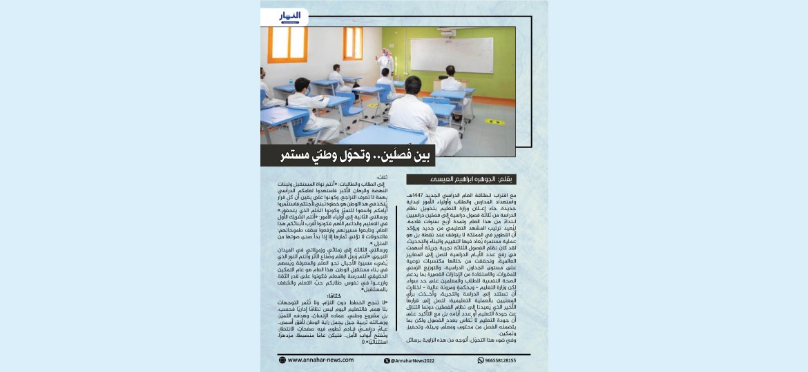 مع اقتراب انطلاقة العام الدراسي الجديد 1447هـ، واستعداد المدارس والطلاب وأولياء الأمور لبداية جديدة، جاء إعلان وزارة التعليم بتحويل نظام الدراسة من ثلاثة فصول دراسية إلى فصلين دراسيين ابتداءً من هذا العام ولمدة أربع سنوات قادمة، ليُعيد ترتيب المشهد التعليمي من جديد ويؤكد أن التطوير في المملكة لا يتوقف عند نقطة بل هو عملية مستمرة يُعاد فيها التقييم والبناء والتحديث.