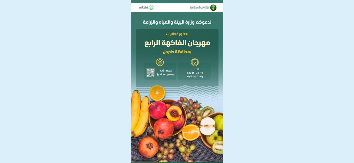 برعاية وزارة البيئة والمياه والزراعة، ممثلة في مكتب الزراعة بمحافظة طبرجل، وبالتعاون مع عدد من الجهات الحكومية، تتواصل فعاليات النسخة الرابعة من مهرجان الفاكهة وسط حضور جماهيري لافت وتنوع استثنائي في المنتجات الزراعية.