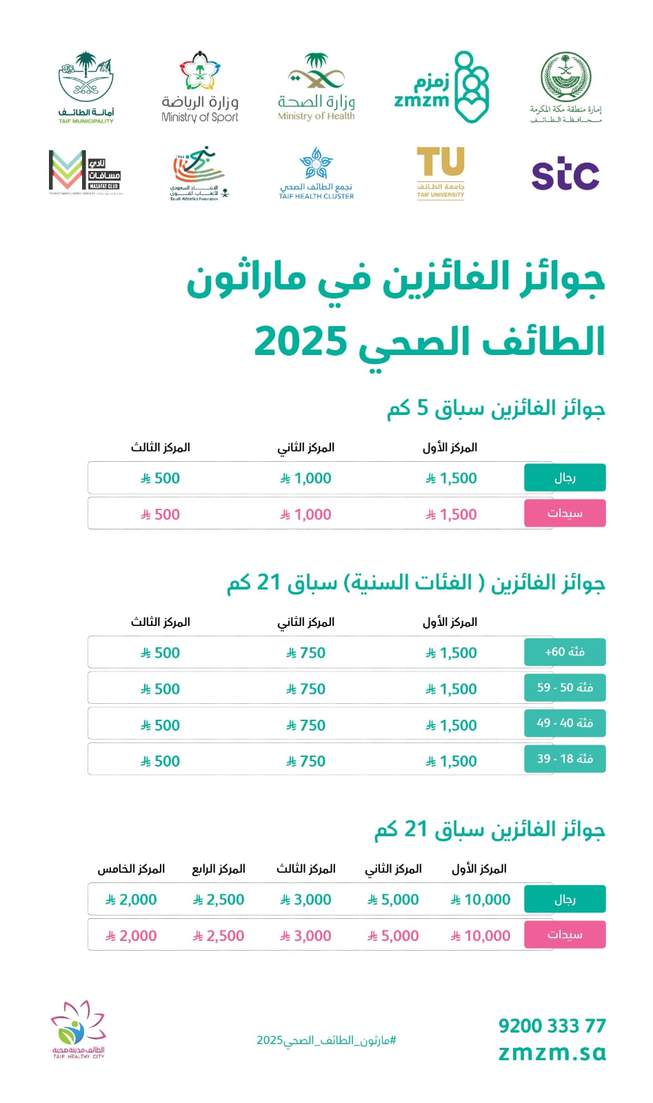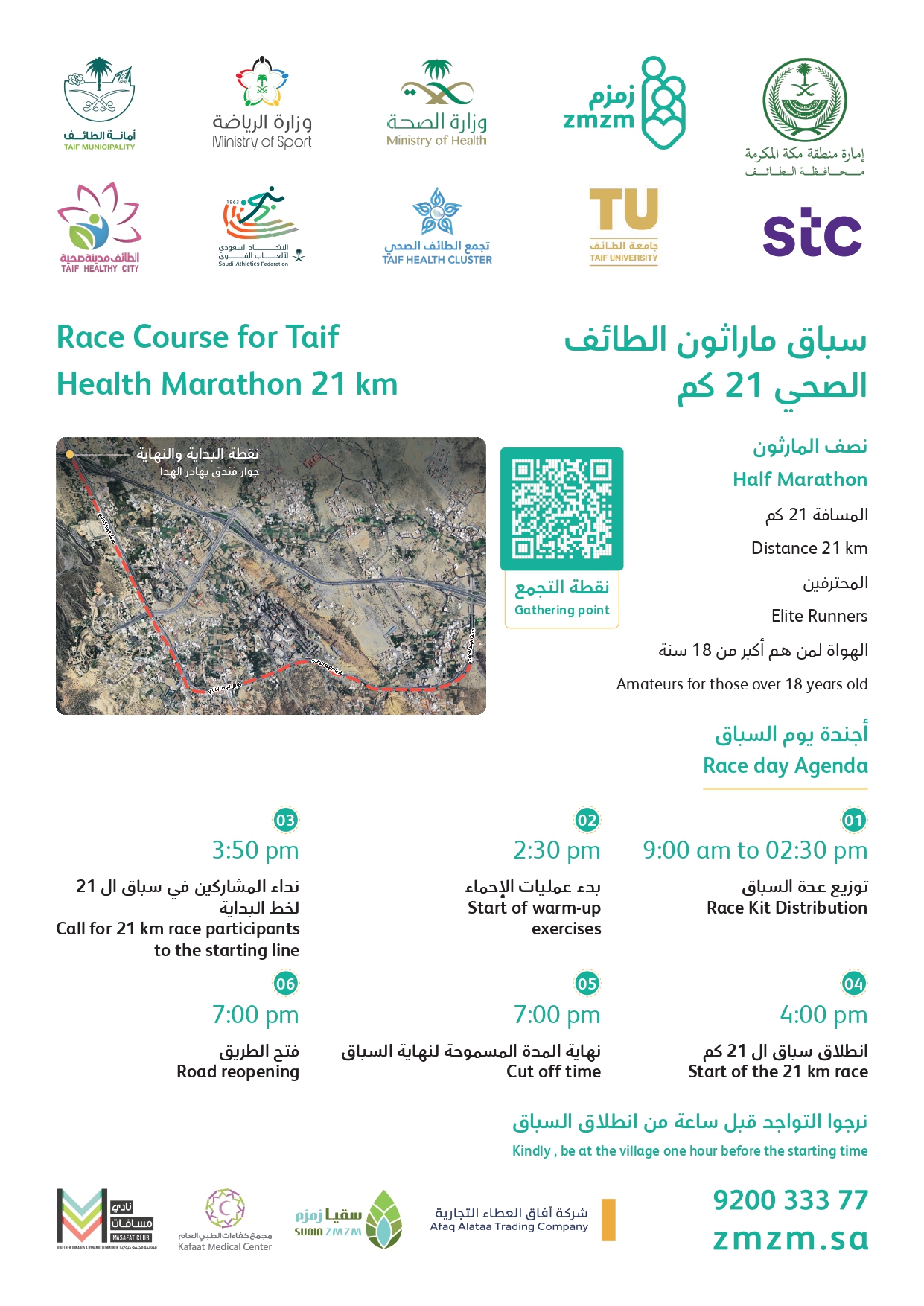 ويأتي تنظيم الماراثون والذي يبلغ 21.5 كم للمحترفين و 5 كم للهواة من المقيمين والسياح، حيث تشهد الطائف هذا الصيف حراك رياضي مميز في إطار دعم برنامج المدن الصحية وبمشاركة وزارة الصحة، ووزارة الرياضة، وأمانة الطائف، وجامعة الطائف.وشركة الإتصالات السعودية وتجمع الطائف الصحي والطائف مدينة صحية والاتحاد السعودي لألعاب القوى وبجوائز محفزة للفائزين للمراكز المتقدمة.