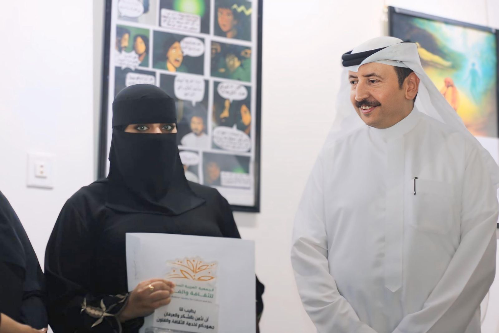 الجدير بالذكر ان المعرض يستمر حتى نهاية يوم الجمعة الموافق 23-8-2025' وقال رئيس لجنة الفنون التشكيلية بالجمعية الفنان ماجد شنقيطي ان المعرض يأخذ الزائر في رحلة بصرية قصصية لونيه، تمزج بين الادب القصصي والفن التشكيلي في تمازج ابداعي