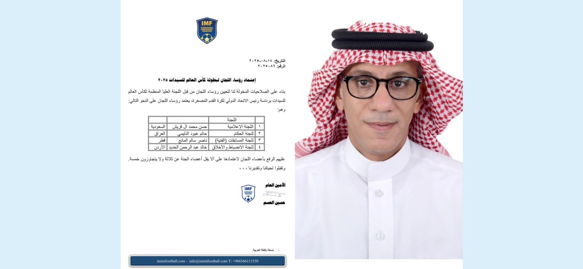 أعلن الاتحاد الدولي لكرة القدم المصغرة (IMF) عن اعتماد رؤساء اللجان المنظمة لبطولة كأس العالم للسيدات لكرة القدم المصغرة "أربيل 2025"، وذلك في إطار التحضيرات الجارية لاستضافة النسخة التاريخية الأولى من البطولة العالمية.