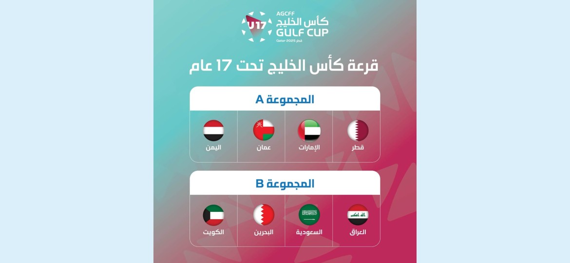 أجريت ظهر اليوم الأربعاء في مقر اتحاد كأس الخليج العربي لكرة القدم بالعاصمة القطرية الدوحة، عبر تقنية الاتصال المرئي (Zoom)، مراسم قرعة بطولة كأس الخليج لمنتخبات الناشئين تحت 17 عامًا، التي تستضيفها قطر خلال الفترة من 20 سبتمبر وحتى 2 أكتوبر 2025، بحضور ممثلي المنتخبات المشاركة.