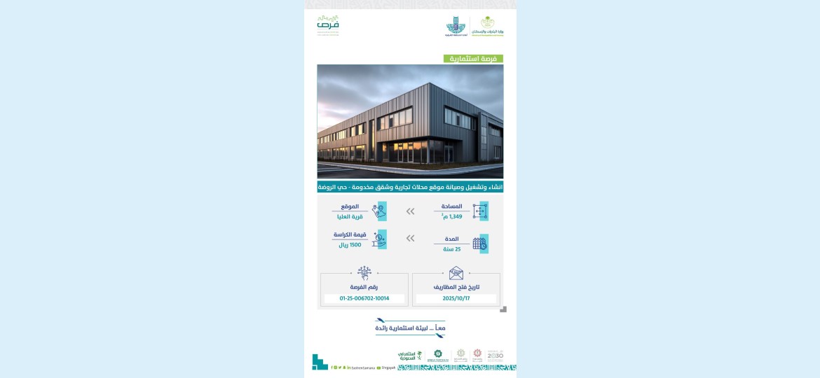 وتتضمن الفرص المطروحة ترميم وتشغيل وصيانة المركز الحضاري بمساحة مبنى تقارب 2,540 مترًا مربعًا وبمساحة إجمالية للموقع تبلغ 16,139 مترًا مربعًا، وذلك بعقد استثماري يمتد لمدة 25 عامًا، ليكون المركز وجهة حضارية متكاملة تقدم أنشطة متعددة وخدمات مساندة تلبي تطلعات المجتمع. كما تشمل الفرص إنشاء وتشغيل وصيانة محلات تجارية على مساحة تقدر بـ 1,500 متر مربع، بعقد مدته 25 عامًا، لتوفير وجهة تجارية حديثة تعزز الحركة الاقتصادية وتلبي احتياجات المستفيدين في المحافظة. إضافة إلى ذلك، تم طرح فرصة استثمارية لإنشاء وتشغيل وصيانة محلات تجارية وشقق مخدومة بمساحة تصل إلى 1,400 متر مربع وبعقد يمتد 25 عامًا، ليشكل مشروعًا متكاملًا يجمع بين الخدمات التجارية والسكنية، بما يسهم في دعم قطاعي الاستثمار والسياحة.