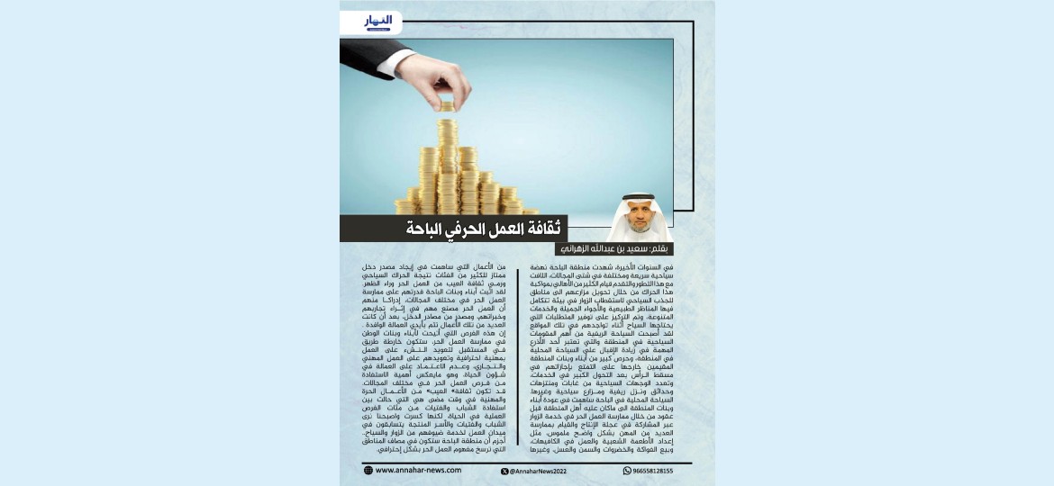 لقد اثبت أبناء وبنات الباحة قدرتهم على ممارسة العمل الحر في مختلف المجالات، إدراكا منهم أن العمل الحر مصنع مهم في إثراء تجاربهم وخبراتهم، ومصدر من مصادر الدخل، بعد أن كانت العديد من تلك الأعمال تتم بأيدي العمالة الوافدة .