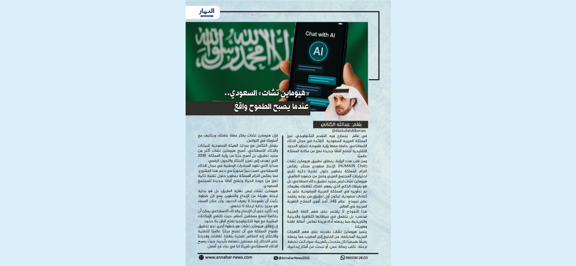 في عالم يتسارع فيه التقدم التكنولوجي، تبرز المملكة العربية السعودية كقائدة في مجال الذكاء الاصطناعي، حاملة معها رؤية طموحة تتجاوز الحدود التقليدية لتفتح آفاقًا جديدة تعزز من مكانة المملكة عالميًا. ومن قلب هذه الرؤية، ينطلق تطبيق هيوماين تشات (HUMAIN Chat) كإنجاز سعودي مبتكر، يعكس التزام المملكة بتطوير حلول تقنية ذكية تلبي احتياجات المجتمع العربي وتعزز من حضوره العالمي.