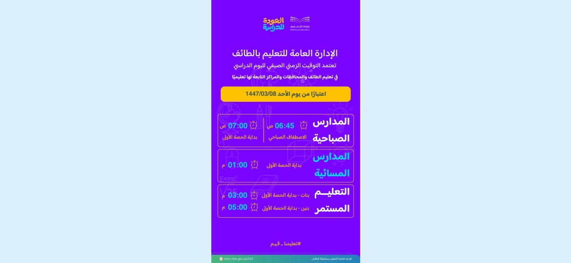 أعلنت الإدارة العامة للتعليم بالطائف عن بدء تطبيق الدوام الصيفي اعتباراً من يوم الأحد 08 ربيع أول 1447 هـ في كافة المراحل الدراسية للبنين والبنات في مدارس الطائف والمحافظات والمراكز التابعة لها تعليميًّا للعام الحالي 1447هـ .
