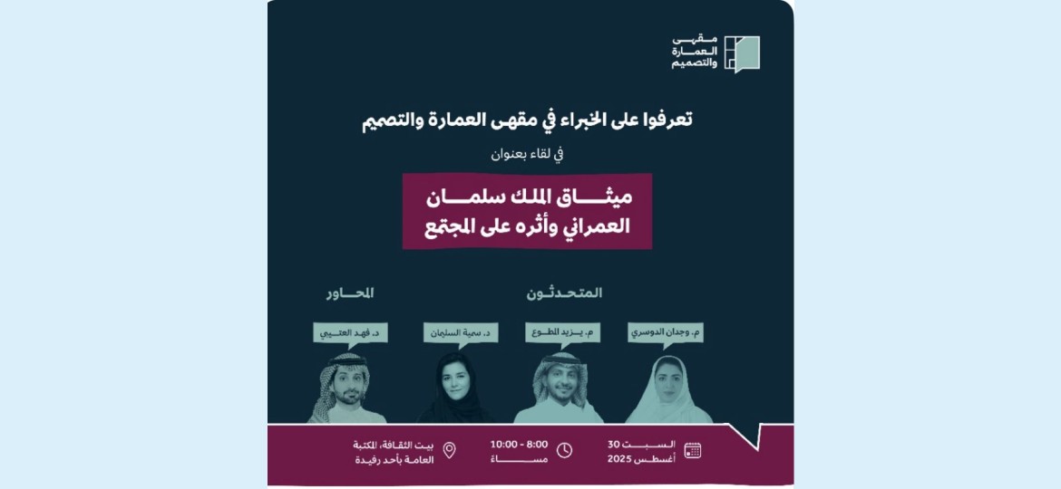 ضمن فعاليات سلسلة لقاءات مقهى العمارة والتصميم، اجتمع نخبة من الخبراء والمختصين في مجال العمارة والتخطيط العمراني في لقاء حواري بعنوان "ميثاق الملك سلمان العمراني وأثره على المجتمع". وناقش المشاركون أبرز القيم والمبادئ التي يتضمنها الميثاق، مستعرضين تأثيره على جودة الحياة وتعزيز الهوية العمرانية في مدن المملكة. كما تناول اللقاء أهمية الميثاق في رسم ملامح التنمية الحضرية المستدامة وتوجيه ممارسات التصميم والعمارة نحو رؤية المملكة المستقبلية.