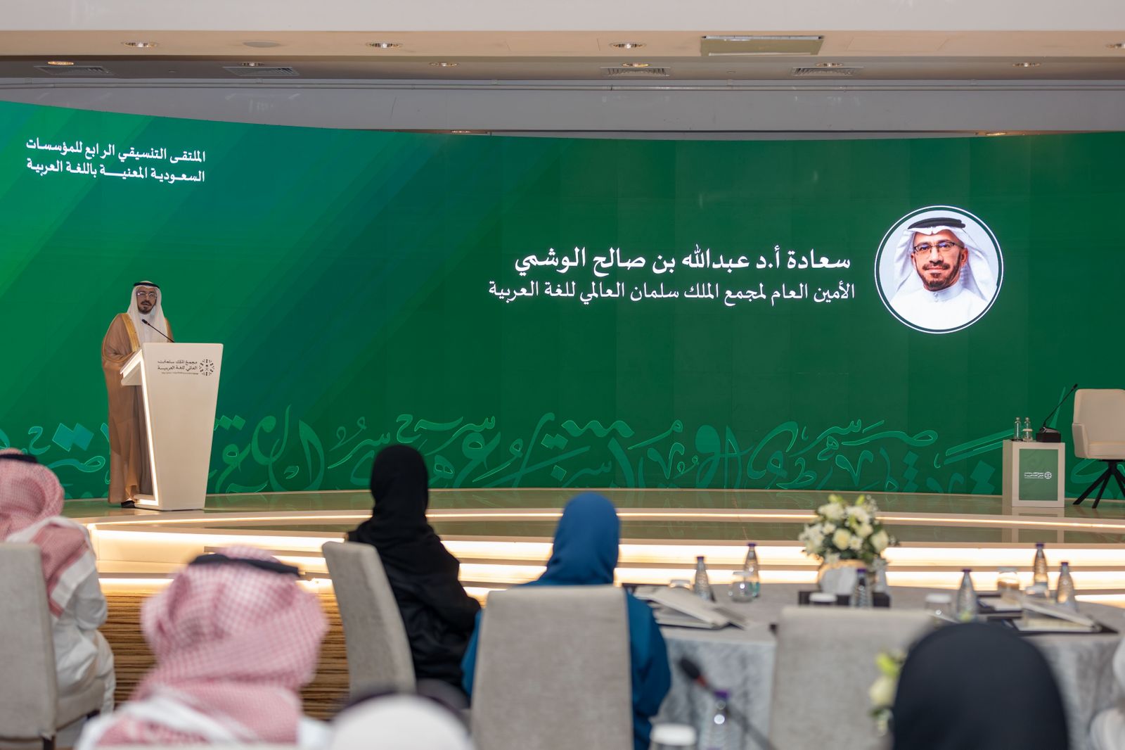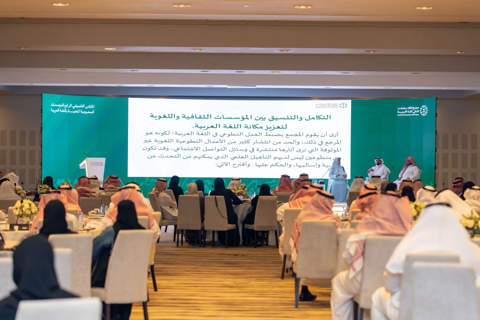 وإستراتيجياته وأهدافه ومشروعاته، وإبراز دور المؤسسات السعودية في خدمة اللغة العربية تخطيطًا وتعليمًا ونشرًا.