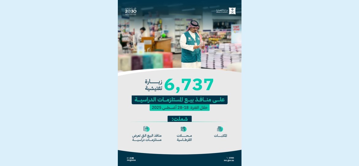 نفذت الفرق الرقابية لوزارة التجارة (6,737) زيارة تفتيشية على منافذ بيع المستلزمات المدرسية في مختلف مناطق المملكة خلال الفترة من 18 - 28 أغسطس 2025، تزامنًا مع بدء العام الدراسي الجديد.