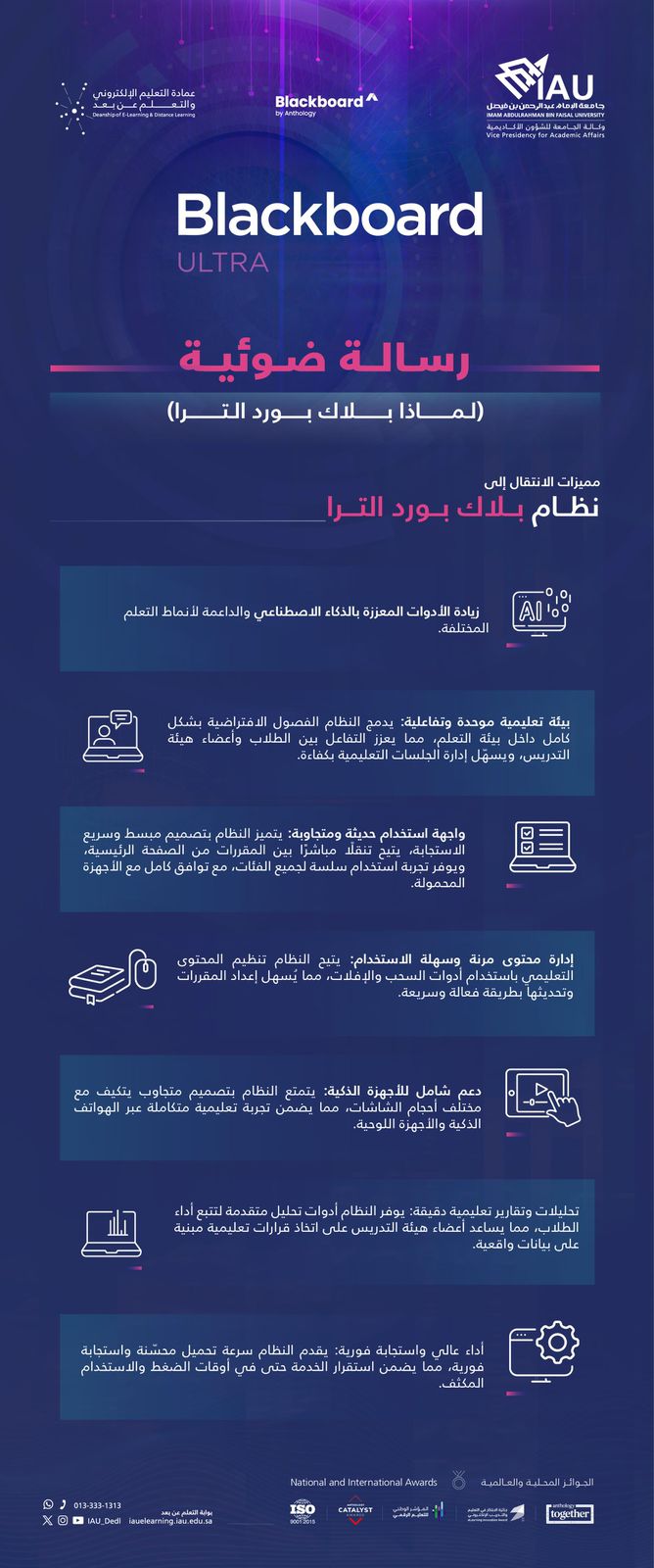 وأكدت أن الانتقال إلى بلاك بورد الترا يعكس رؤية استراتيجية وطنية تستثمر في مستقبل طلاب الجامعة وأعضاء هيئة التدريس، وترسخ مكانة الجامعة كمؤسسة أكاديمية مبتكرة تقدم صناعة فريدة في التحول الرقمي في التعليم العالي في المملكة العربية السعودية.