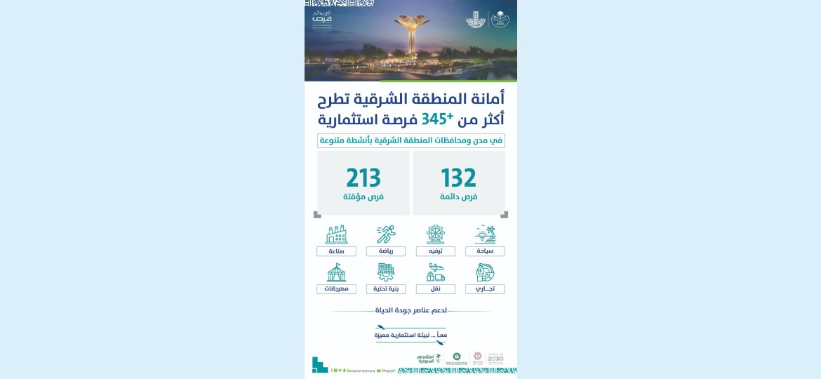 طرحت أمانة المنطقة الشرقية 345 فرصة استثمارية دائمة ومؤقتة في مختلف مدن ومحافظات المنطقة، ضمن نماذج استثمارية متنوعة تهدف إلى تطوير منظومة الاستثمار البلدي وتشجيع مشاركة القطاع الخاص في التنمية المحلية، بعض هذه الفرص تتطلب تقديم عروض فنية وخبرات تأهيلية لضمان جودة المشاريع ونوعية الخدمات، إضافة إلى قدرة وكفاءة المستثمرين على الإنجاز.