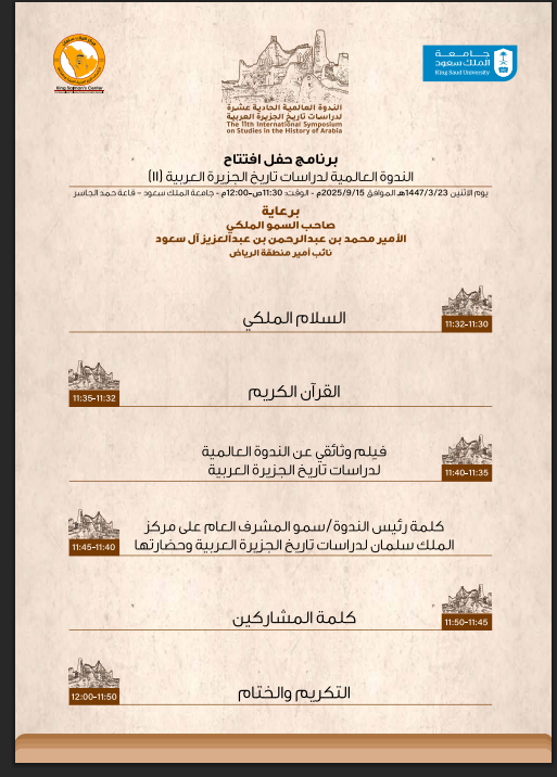 تستعد جامعة الملك سعود ممثلة في مركز الملك سلمان لدراسات تاريخ الجزيرة العربية وحضارتها، لانطلاق أعمال الندوة العالمية لدراسات تاريخ الجزيرة العربية (الحادية عشرة)، وذلك يوم الاثنين 23 / 7 / 1447هـ الموافق 15 / 9 / 2025م، في قاعة الشيخ حمد الجاسر بالجامعة، برعاية صاحب السمو الملكي الأمير محمد بن عبدالرحمن بن عبدالعزيز آل سعود نائب أمير منطقة الرياض.