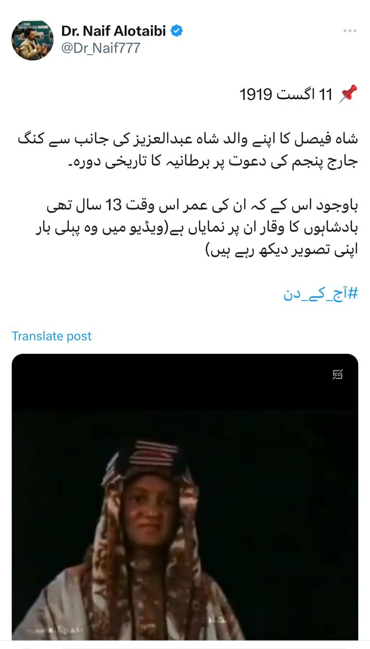 وقد بثّث قناة Samaa الباكستانية تقريراً عن الزيارة التاريخية التي قام بها الأمير فيصل بن عبد العزيز (الملك) الى بريطانيا والتي كانت في 11 أغسطس 1919.