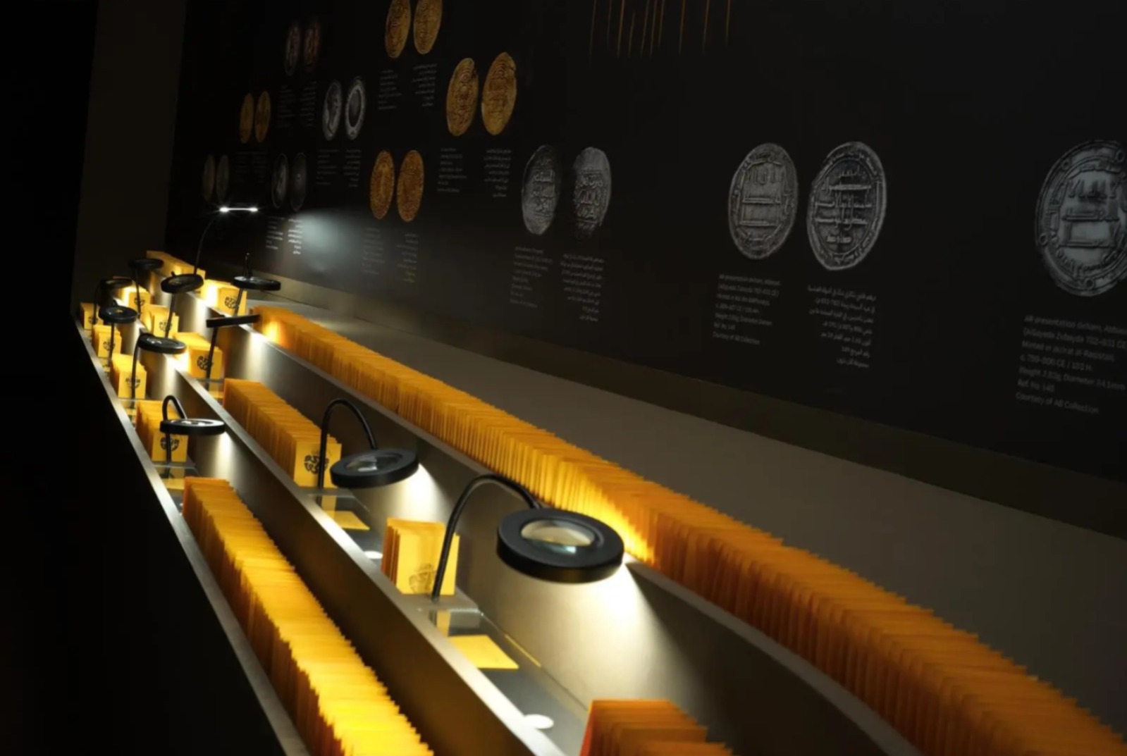 ويضم المعرض مجموعة استثنائية من العملات والمسكوكات النادرة من مقتنيات الدكتور آلان بارون، أحد أبرز جامعي العملات التاريخية، إلى جانب مختارات فريدة من مجموعة وزارة الثقافة، كما يقدم أعمالًا فنية معاصرة بمشاركة الفنان زيمون الذي استلهم من رمزية النقود، ودلالاتها البصرية، ضمن تصميم سينوغرافي مبتكر أبدعه غيث أبو غانم، وجاد مالكي، وفرح فياض، وبمشاركة الدكتور نايف الشرعان المتخصص في تاريخ العملات الإسلامية، حيث جرى دمج المشاهد الفنية والمعمارية؛ لتجسيد أزمنة مختلفة في قاعة واحدة.