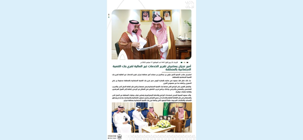 استعرض صاحب السمو الأمير جلوي بن عبدالعزيز بن مساعد أمير منطقة نجران، تقرير الخدمات غير المالية لفرع بنك التنمية الاجتماعية بالمنطقة، و جاء ذلك خلال لقاء سموه في مكتبه بالإمارة اليوم، مدير فرع بنك التنمية الاجتماعية بالمنطقة محفوظ بن علي العسيري، يرافقه عددٌ من منسوبي الفرع.واشتمل التقرير على البرامج التي نفذها بنك التنمية الاجتماعية ومن ضمنها برنامج نشر ثقافة العمل الحر، والتدريب المتخصص، والمهني والحرفي، وكذلك برنامج تدريب العاملين في القطاع غير الربحي، إضافة إلى تأهيل المرشدين، وإقامة جلسات حوارية.