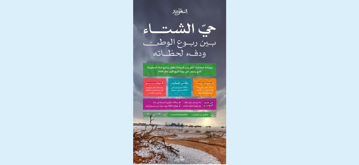 أعلن وزير السياحة عن إطلاق برنامج شتاء السعودية ضمن روزنامة استثنائية، والذي يستمر حتى نهاية الربع الأول من عام 2026. ويهدف البرنامج إلى إبراز تنوع الوجهات السياحية في المملكة، وتقديم تجارب ثرية للزوار والمقيمين.