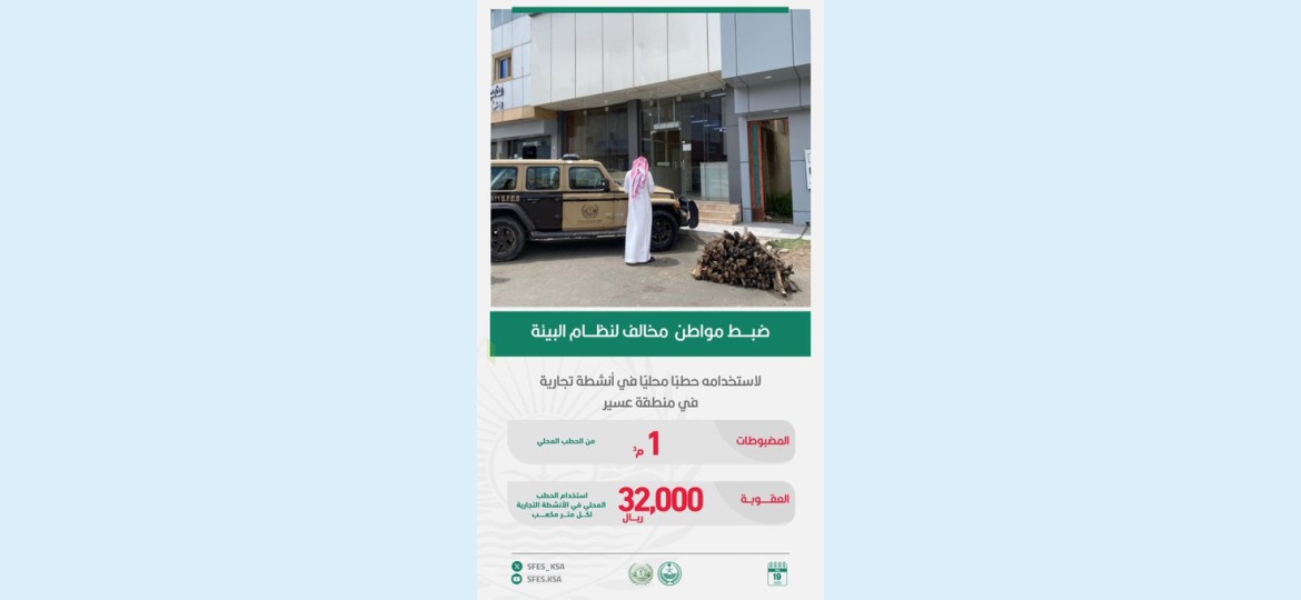ضبطت القوات الخاصة للأمن البيئي بالتعاون مع المركز الوطني لتنمية الغطاء النباتي ومكافحة التصحر مواطنًا مخالفًا لنظام البيئة، بحوزته متر مكعب من الحطب المحلي المستخدم في أنشطة تجارية في منطقة عسير، وطُبِّقَت الإجراءات النظامية بحقه، وتسليم الكميات المضبوطة للجهات المختصة.