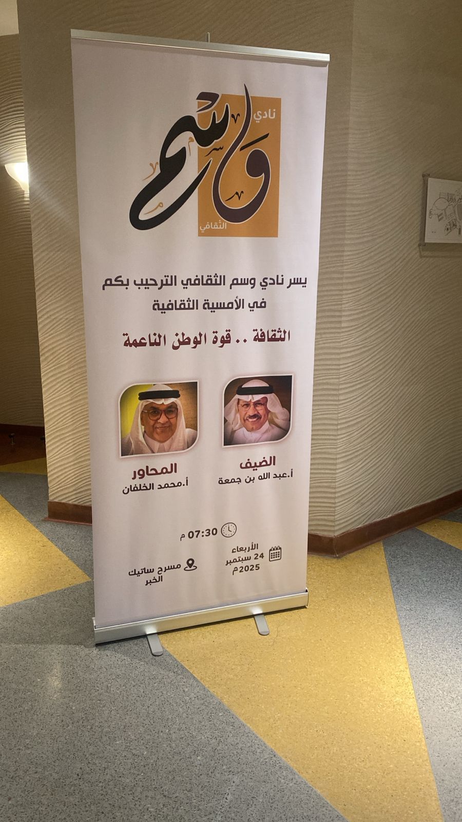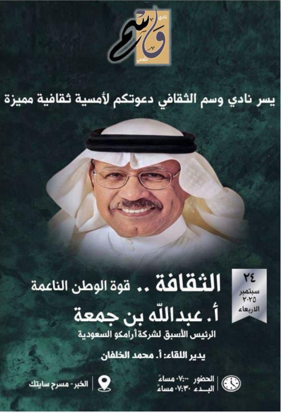 احتفاءً بذكرى اليوم الوطني السعودي الـ٩٥، أقام نادي وسم الثقافي مساء الثلاثاء ٢٤ سبتمبر ٢٠٢٥ أمسية حوارية بعنوان: «الثقافة… قوة الوطن الناعمة»، استضاف فيها الأستاذ عبدالله جمعة الرئيس الأسبق لأرامكو السعودية، وأحد الأسماء البارزة في المشهد الثقافي والفكري، وصاحب تجربة ثرية مع القراءة والاطلاع على عوالم الترجمة. أدار الحوار عضو النادي الأستاذ محمد الخلفان، وسط حضور واسع من المثقفين والمهتمين.