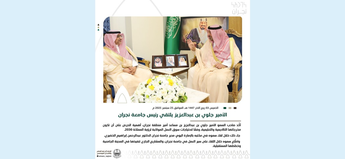 أكَّد صاحب السمو الأمير جلوي بن عبدالعزيز بن مساعد أمير منطقة نجران، أهمية الحرص على أن تكون مخرجاتها الأكاديمية والتعليمية، وفقًا لاحتياجات سوق العمل المواكبة لرؤية المملكة 2030.