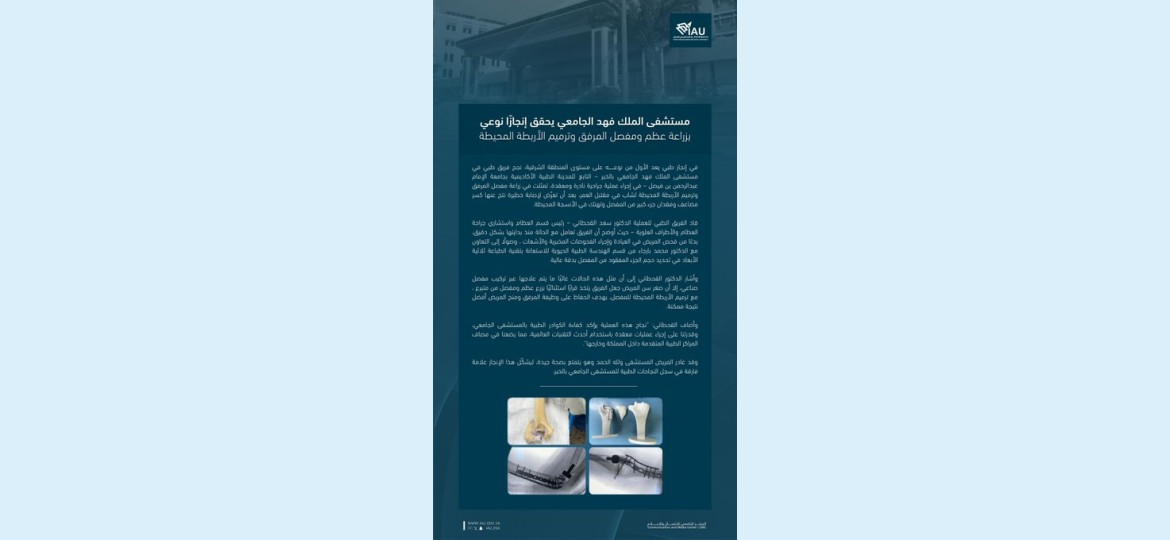 نجح فريق طبي في مستشفى الملك فهد الجامعي بالخبر –التابع للمدينة الطبية الأكاديمية بجامعة الإمام عبدالرحمن بن فيصل- في إجراء عملية جراحية نادرة ومعقدة، تمثلت في زراعة مفصل المرفق وترميم الأربطة المحيطة لشاب في مقتبل العمر، بعد أن تعرّض لإصابة خطيرة نتج عنها كسر مضاعف وفقدان جزء كبير من المفصل وتهتك في الأنسجة المحيطة، ويعد هذا الإنجاز الطبي الأول من نوعه على مستوى المنطقة الشرقية.