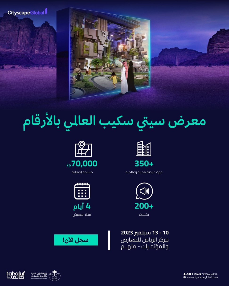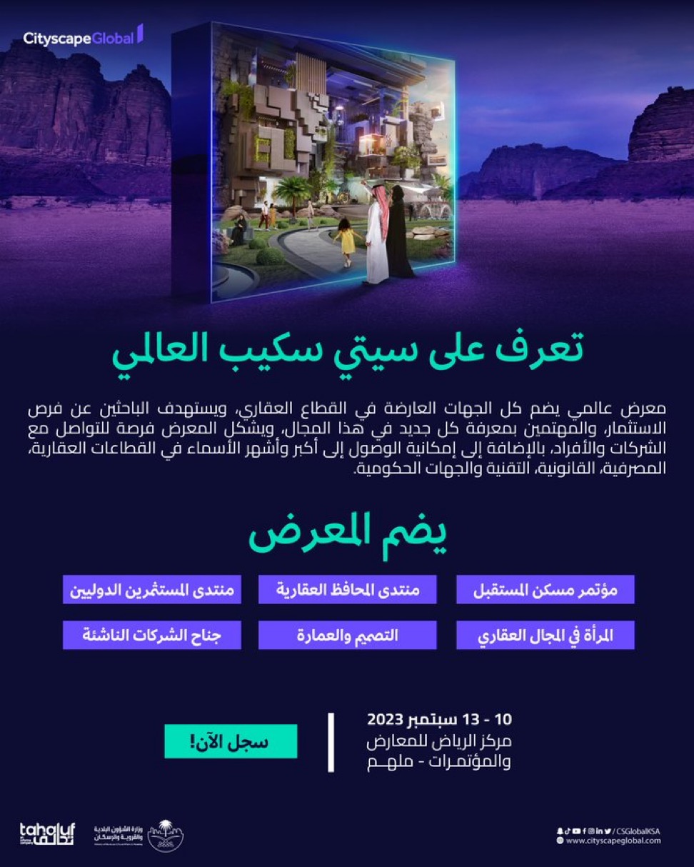 تنطلق فعاليات معرض "سيتي سكيب العالمي" في مدينة الرياض خلال الفترة من 10 إلى 13 سبتمبر 2023م برعاية وزارة الشؤون البلدية والقروية والإسكان وبتنظيم من شركة تحالف تحت عنوان "لبناء مسكن المستقبل"، بحضور نخبة من المتحدثين والخبراء والمهتمين بالقطاع العقاري، والمطورين العقاريين الدوليين والمحليين، والمصممين الداخليين، والمهتمين بشراء الوحدات العقارية، حيث سيُعقد المعرض في مركز الرياض للمعارض والمؤتمرات في ملهم شمال مدينة الرياض.