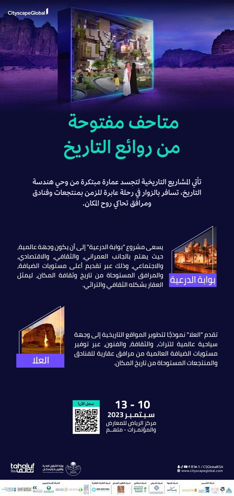 يذكر أن معرض سيتي سكيب العالمي يعد حدثًا مهمًا لاستعراض مستجدات القطاع العقاري ومناقشة التحديات عبر جلسات حوارية وورش عمل متخصصة، كما يضم المعرض قمة نيوم لبناء مسكن المستقبل، ومنتدى المحافظ العقارية، ومسرح التصميم والعمارة، بالإضافة إلى منتدى مستثمري العقار، ومسرح التقنيات العقارية، وتحدي الابتكار الذي يتيح للشركات الناشئة عرض أفكارهم لخلق مستقبل أكثر ابتكارًا، وهاكاثون سيتي سكيب العالمي روشن الذي يخلق منافسة بين المتسابقين لإيجاد حلول نوعية في القطاع.