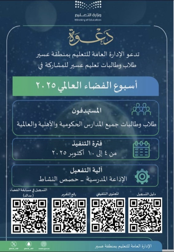 دعت الإدارة العامة للتعليم في منطقة عسير جميع طلاب وطالبات المدارس الحكومية والأهلية والعالمية إلى المشاركة في فعاليات "أسبوع الفضاء العالمي 2025"، الذي يُنفّذ خلال المدة من 4 إلى 10 أكتوبر 2025م؛ بهدف تعزيز الوعي العلمي والمعرفي لدى الطلبة، وتشجيعهم على الاهتمام بعلوم الفضاء واستكشافاته.