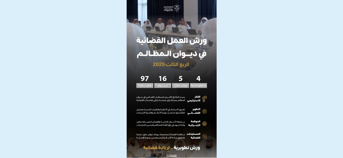 يأتي تنظيم هذه الورش في إطار حرص ديوان المظالم على تجويد العمل القضائي والإداري بديوان المظالم وتطوير إجراءاته بما يواكب الأنظمة والمستجدات التشريعية، ويعزز جودة مخرجات القضاء الإداري، كما يعكس اهتمامه بتوفير بيئة قضائية متكاملة تُسهم في رفع كفاءة الأداء وتوحيد الإجراءات، وترسيخ دوره الريادي بصفته جهة قضائية تسعى دائمًا إلى تحقيق العدالة وتطوير ممارساتها وفق أعلى المعايير.