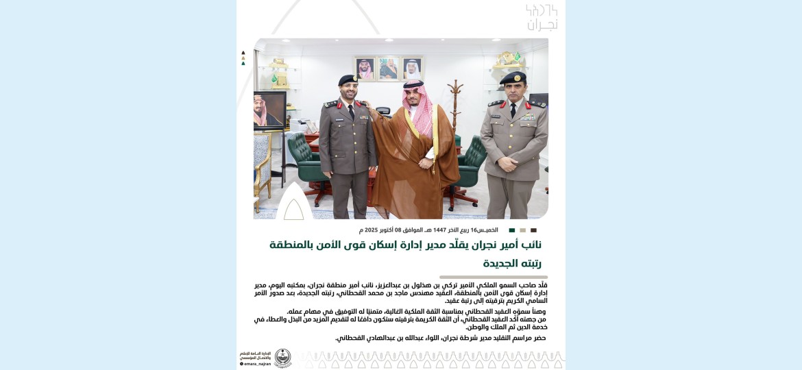 قلّد صاحب السمو الملكي الأمير تركي بن هذلول بن عبدالعزيز، نائب أمير منطقة نجران، بمكتبه اليوم، مدير إدارة إسكان قوى الأمن بالمنطقة، العقيد مهندس ماجد بن محمد القحطاني، رتبته الجديدة، بعد صدور الأمر السامي الكريم بترقيته إلى رتبة عقيد.