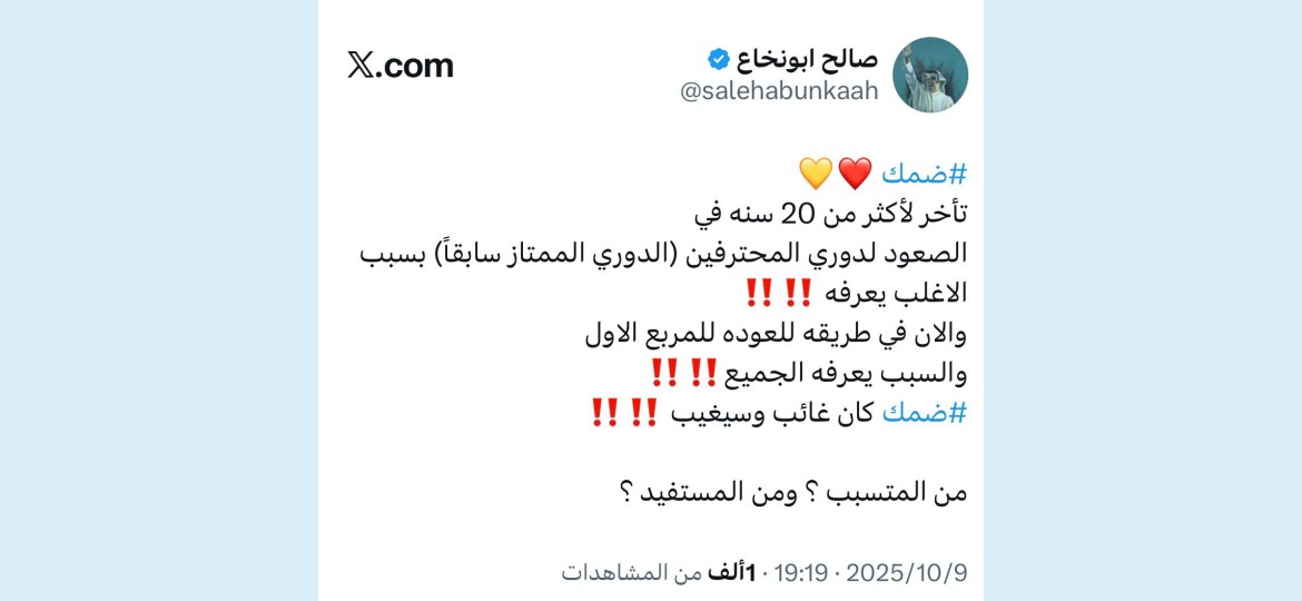 في تصريح واضح عبر حسابه بمنصة X، أشار صالح أبو نخاع الرئيس السابق لنادي ضمك إلى أن نادي ضمك تأخّر لأكثر من 20 عامًا في الصعود لدوري المحترفين (الدوري الممتاز سابقًا)، والسبب؟ الكل يعرفه، لكن لا أحد تجرأ على مواجهته‼️