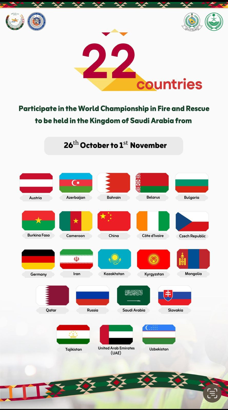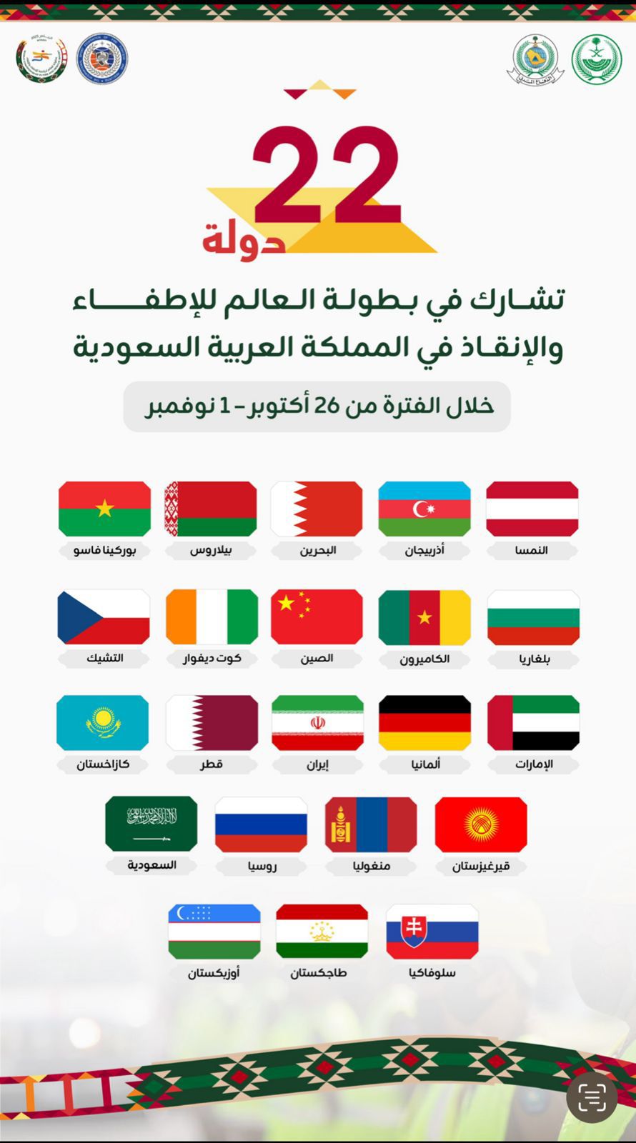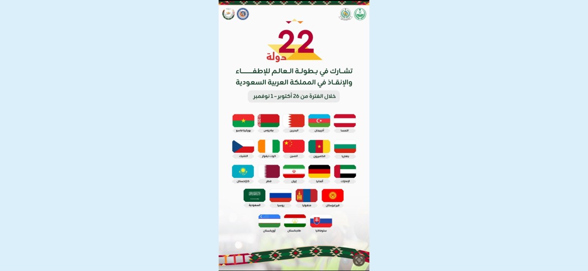 تستضيف العاصمة الرياض خلال الفترة من (26) أكتوبر إلى (1) نوفمبر القادم بطولة العالم لرياضة الإطفاء والإنقاذ، بمشاركة (22) دولة، في حدثٍ يعد من أبرز المنافسات العالمية المتخصصة في هذا المجال.