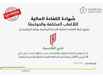 وتُعد هذه الشهادة تأكيدًا على التزام نادي القادسية بتطبيق أعلى معايير الانضباط المالي والإداري، وحرصه على تحقيق التوازن بين الأداء الرياضي والحوكمة الفاعلة، بما يضمن استمرار تطوير منظومة الألعاب المختلفة داخل النادي وفق أسس احترافية ومستدامة.