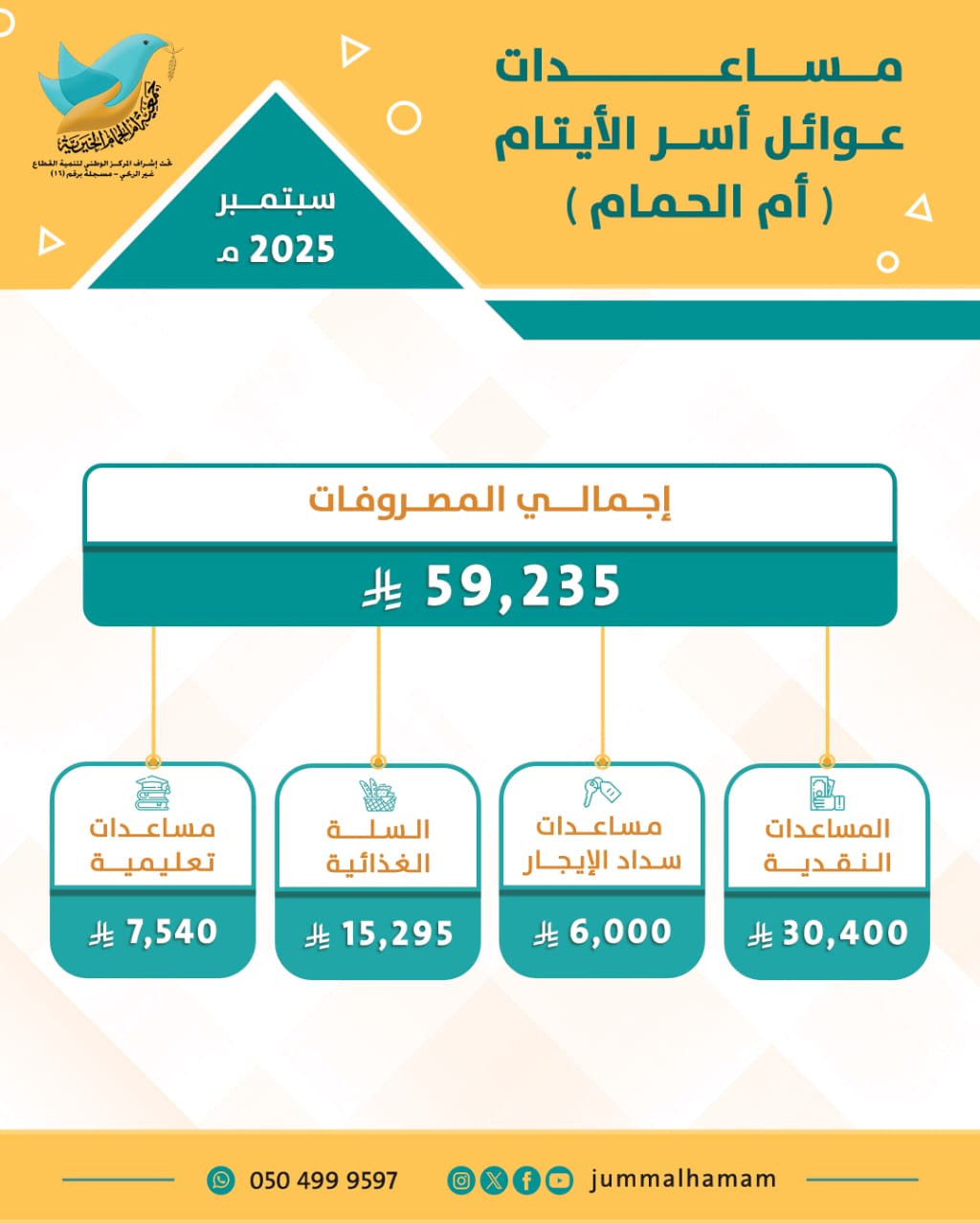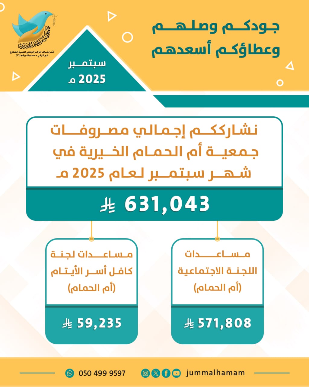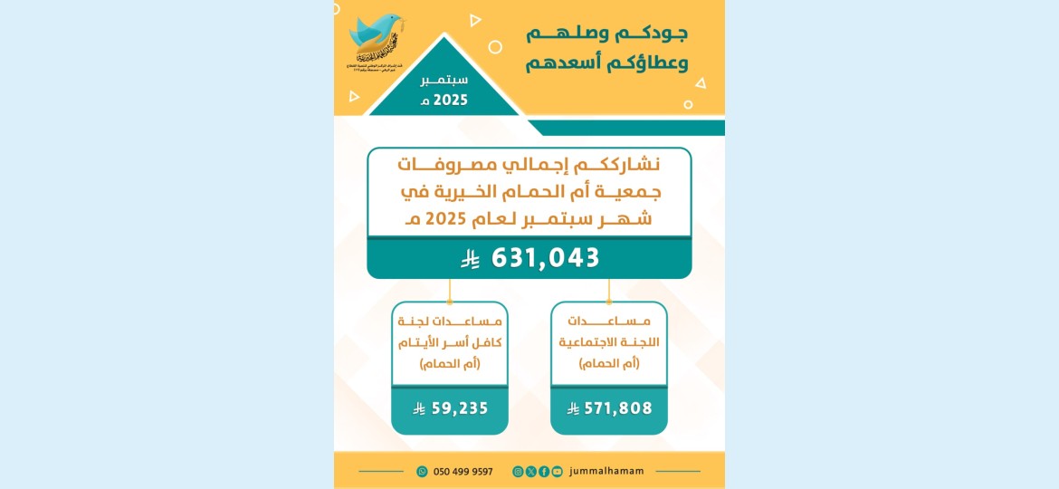 تجاوزت مصاريف مساعدات البرامج والأنشطة الاجتماعيّة في جمعيّة أمّ الحمام الخيريّة للخدمات الإنسانيّة خلال شهر سبتمبر 2025م، نصف مليون ريال، وذلك بإجماليّ مبلغٍ قدره (631043 ريال) ستمئة وواحد وثلاثون ألفاً وثلاثة وأربعون ريالاً، حيث توزّع المبلغ على برامج وأنشطة الجمعيّة المتعدّدة، والمساعدات العينيّة والنقديّة الدائمة والمقطوعة للمستفيدين من المحتاجين وذوي الدخل المحدود وعوائل أسر الأيتام.