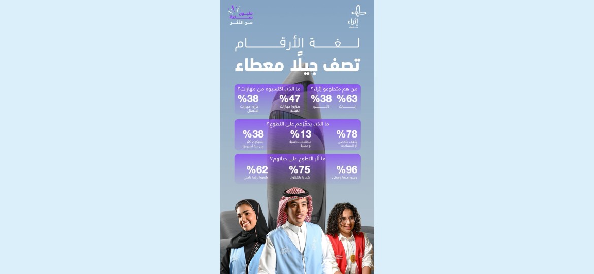 في خطوةٍ رائدة وتمثل علامة فارقة في تاريخ العمل التطوعي الثقافي في المملكة، يحتفي مركز الملك عبد العزيز الثقافي العالمي (إثراء) مبادرة أرامكو السعودية اليوم بإنجازٍ غير مسبوق، حيث تجاوز عدد الساعات التطوعية في المركز "مليون" ساعة تطوع، وأكثر من 24 ألف متطوع يشارك في تحقيق أهداف ورسالة المركز من خلال المشاركة في المبادرات والفعاليات والبرامج التفاعلية، ناسجين بذلك قصصًا و تجارب ملهمة صنعت المشهد وخلّدت الأثر.