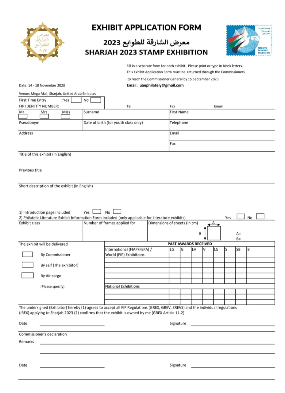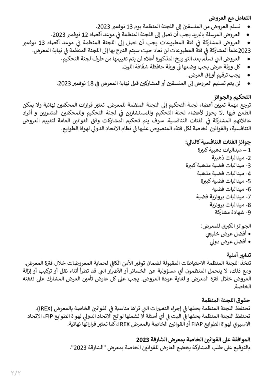 وقد وجهت الجمعية الدعوات وارفقت بها استمارة المشاركة والنشرة الإعلامية لمعرض الشارقة 2023. واهابت في حالة الأهتمام بالمشاركة في المعرض، لابد من تعبئة الاستمارة المرفقه وإرسالها قبل 15 سبتمبر 2023م