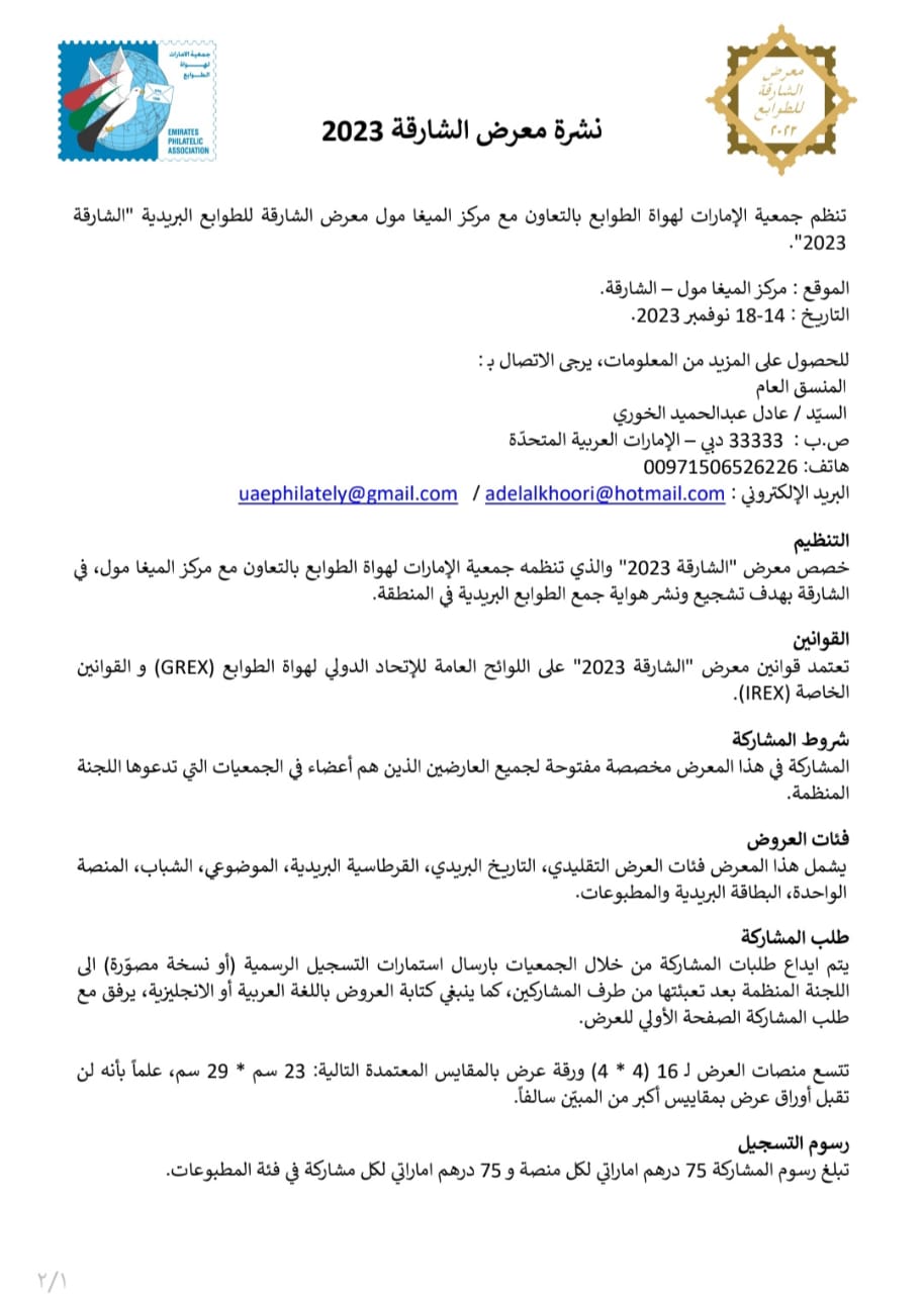 تنظم جمعية الإمارات لهواة الطوابع بالتعاون مع مركز ميغا مول الشارقة، خلال الفترة من 14 إلى 18 نوفمبر 2023م، معرض الشارقة للطوابع البريدية "الشارقة 2023" بهدف تشجيع ونشر هواية جمع الطوابع البريدية.