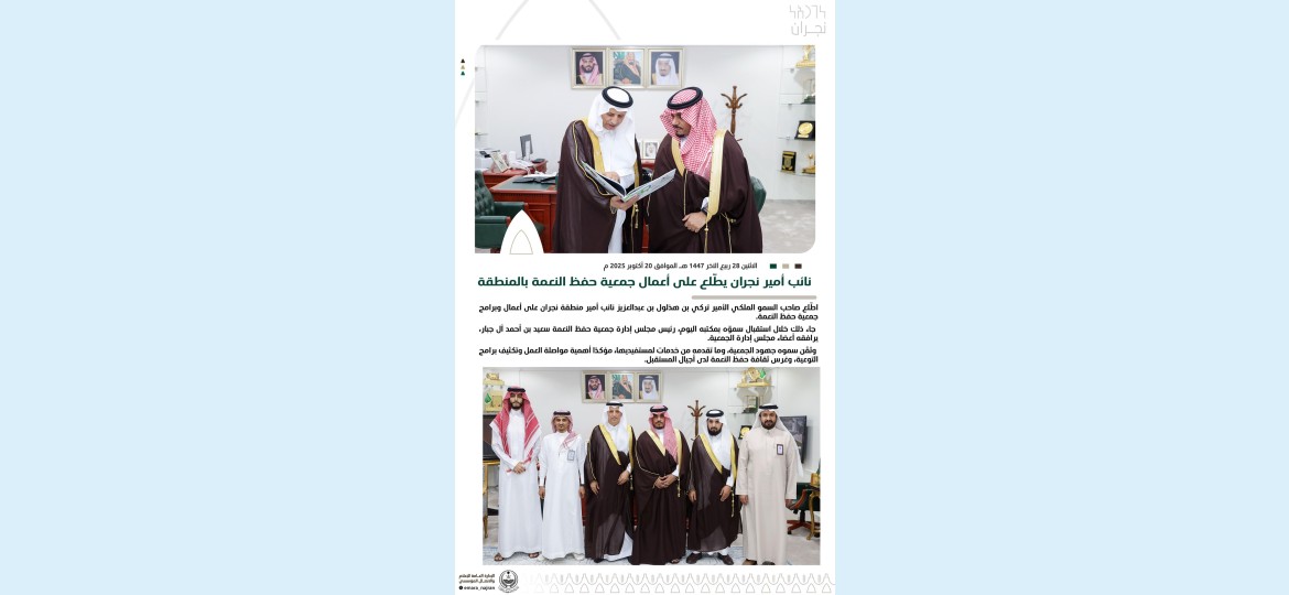اطّلع صاحب السمو الملكي الأمير تركي بن هذلول بن عبدالعزيز نائب أمير منطقة نجران على أعمال وبرامج جمعية حفظ النعمة.