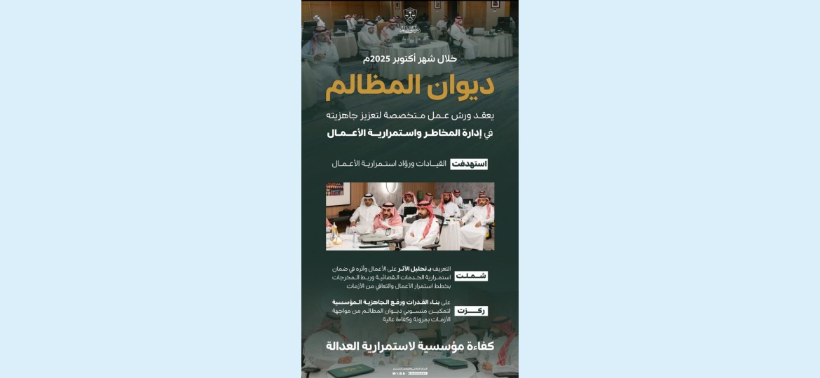 يُذكر أن ديوان المظالم فعّل مطلع العام الجاري أعمال وتوجيهات اللجنة التوجيهية لنظام إدارة المخاطر واستمرارية الأعمال، وقد تُوّجت الجهود بحصول ديوان المظالم في أغسطس الماضي على شهادة الأيزو (ISO 22301) المعيار الدولي المعتمد لنظام إدارة استمرارية الأعمال، وباعتماد من المركز السعودي للأعمال، بعد استيفاء جميع متطلباته في أعماله القضائية والإدارية والخدمات الرقمية.