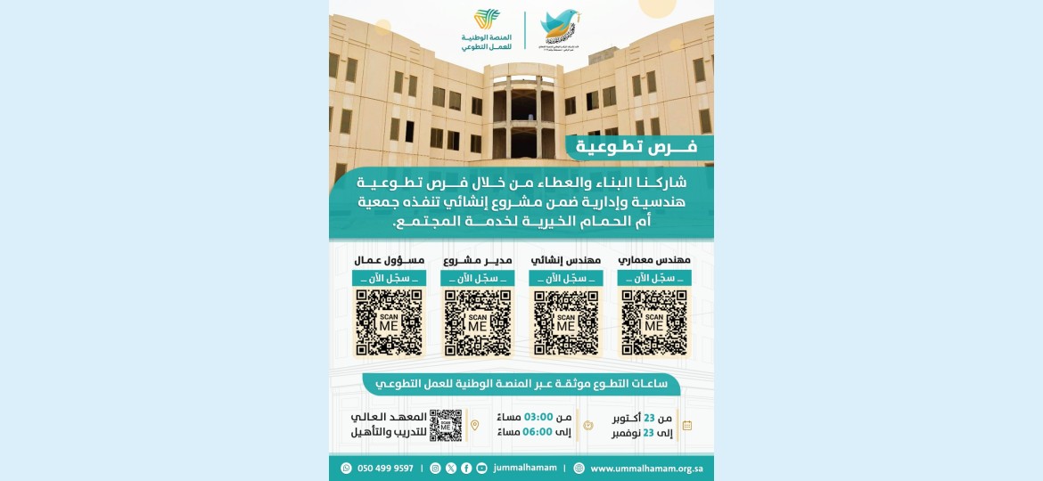وأوضحت الجمعية أنّ هذه الفرص تأتي ضمن مشروع إنشائي يتمّ تنفيذه حالياً، وترغب في استقطاب المتطوّعين القادرين على الإسهام بخبراتهم ومهاراتهم في إنجاح المشروع.