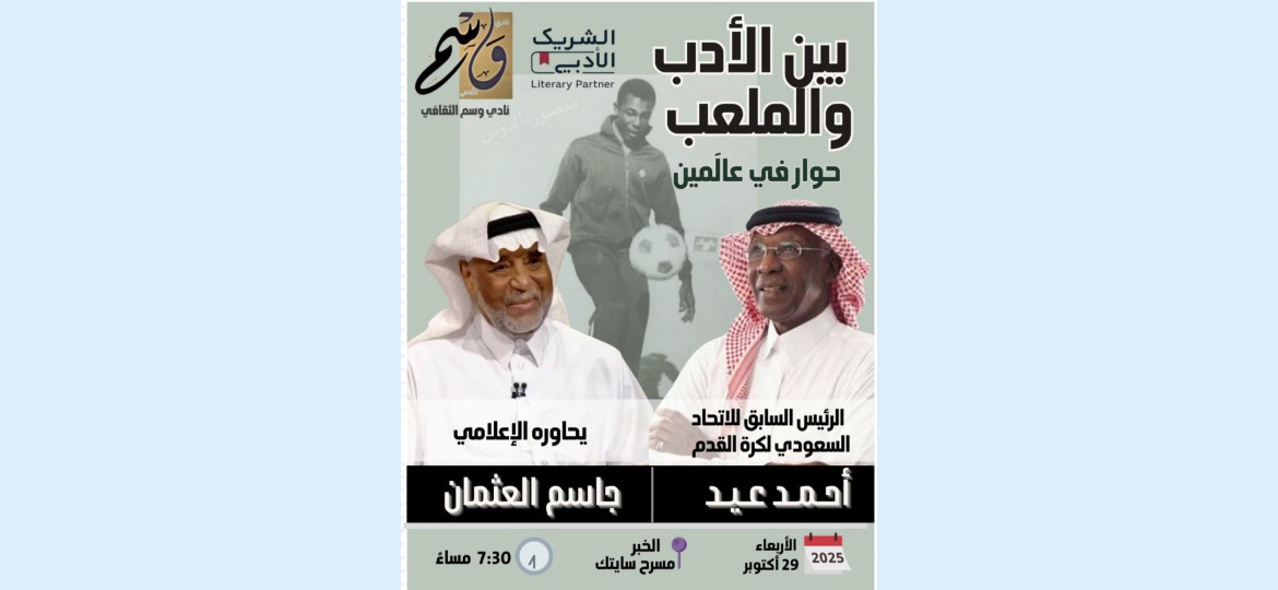 يستضيف  نادي وسم الثقافي  مساء يوم الاربعاء  29 أكتوبر 2025م أمسية حوارية بعنوان “بين الأدب والملعب”، سيكون الضيف فيها  الرئيس الأسبق للاتحاد السعودي لكرة القدم الأستاذ أحمد عيد الحربي، وعضو مجلس الكونجرس الدولي الفيفا في لقاءٍ يفتح آفاق الحوار بين التجربة الرياضية والوعي الثقافي.