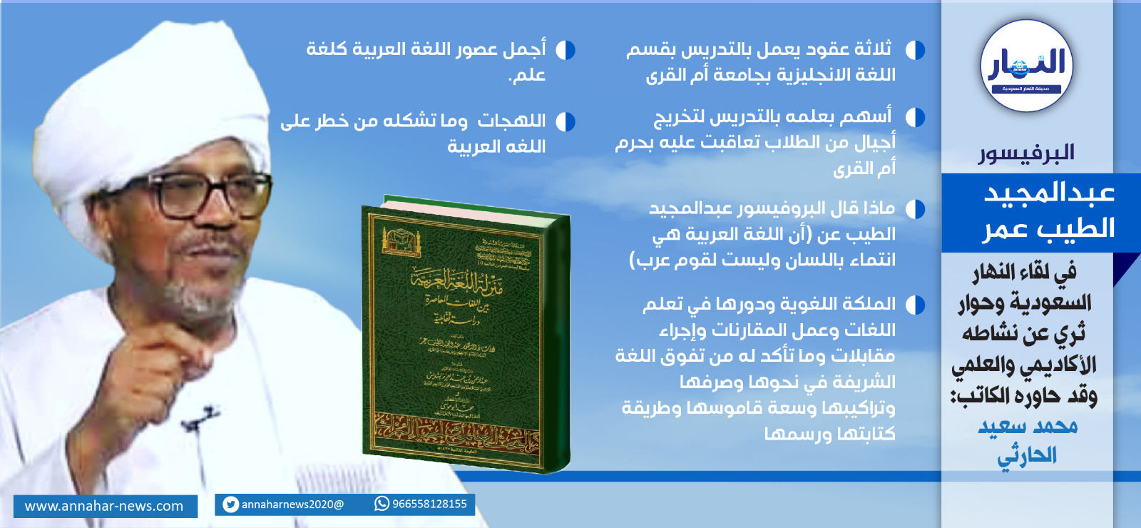 قامة سامقة مثل النخلة بأرض العرب مثمرة وشهية برطبها هو كذلك البروفيسور عبدالمجيد الطيب عمر تنهل من علمه ومن ثقافته وتجربته في الحياة من خلال رحلة علمية ثرية بدء من دراسته بوطنه السودان من مسقط رأسه مدينه عرب بالجزيرة الخضراء وقد تخصص باللغة العربية واللغة الإنجليزية لإستكمال رحلته العلمية ليمر من خلالها بمحطات متعددة في طلب العلم بدءً من بيروت إلى ويلز ببريطانيا ومنها للجامعات الامريكية أشهرها هارفارد العريقة وهذه الفترة كانت خلال الثمانينيات الميلادية ليعود لأرض و طنه للعمل به ومن ثم يستأنف رحلته إلى مكه حيث عمل بالتدريس بقسم اللغة الإنجليزية بجامعة أم القرى .. تفاصيل الحوار تطالعونه يوم غد في (لقاء النهار) الذي أجراه الكاتب بصحيفة النهار السعودية الأستاذ محمد بن سعد الحارثي ..