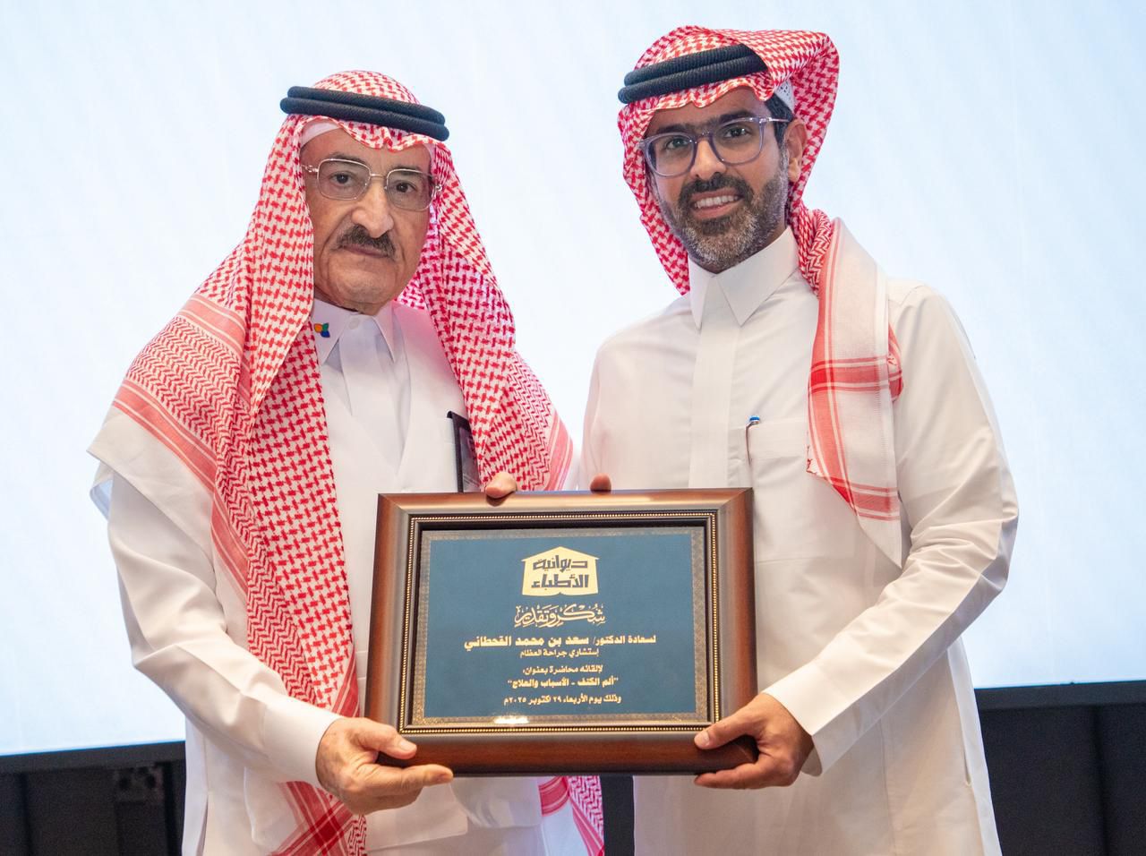 وتناول الدكتور سعد القحطاني، الذي يعمل ايضاً رئيس قسم جراحة العظام بمستشفى الملك فهد الجامعي بالخبر التابع لجامعة الامام عبدالرحمن بن فيصل، الأسباب الرئيسية لألم الكتف ومنها: التهاب أو قطع أوتار الكتف، الكتف المتجمدة "الكتف المتيبس"، التهاب وخشونة المفصل، خلع أو كسر الكتف، إصابات العضلة ذات الرأسين، التهاب مفصل الأخرم والترقوة، ألم مُحال من الرقبة أو القلب، متلازمة الانحشار العظمي، مؤكداً بأن ألم الكتف متنوع الأسباب لكنه قابل للعلاج في معظم الحالات مع ضرورة الكشف المبكر والعلاج المنتظم، وأن العلاج لدى متخصص يسهل ويمنع المضاعفات.