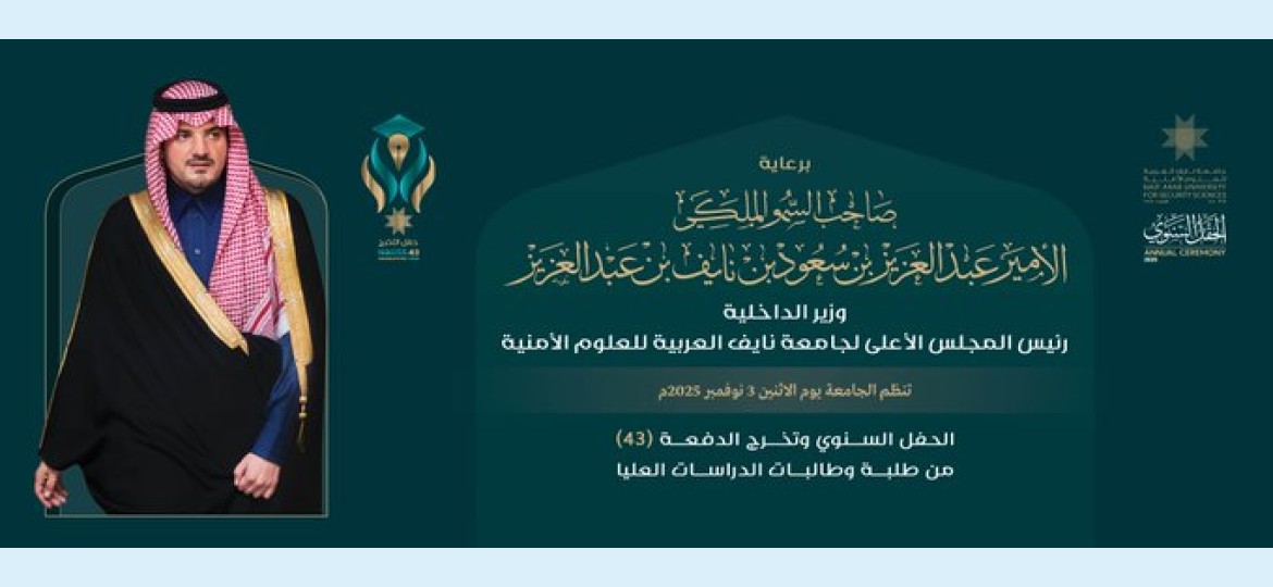 يرعى صاحب السمو الملكي الأمير عبدالعزيز بن سعود بن نايف بن عبد العزيز، وزير الداخلية رئيس المجلس الأعلى لجامعة نايف العربية للعلوم الأمنية، يوم الاثنين 3 نوفمبر، الحفل السنوي للجامعة وتخريج (374) طالبًا وطالبة من الدفعة (43) يمثلون (11) دولة عربية.