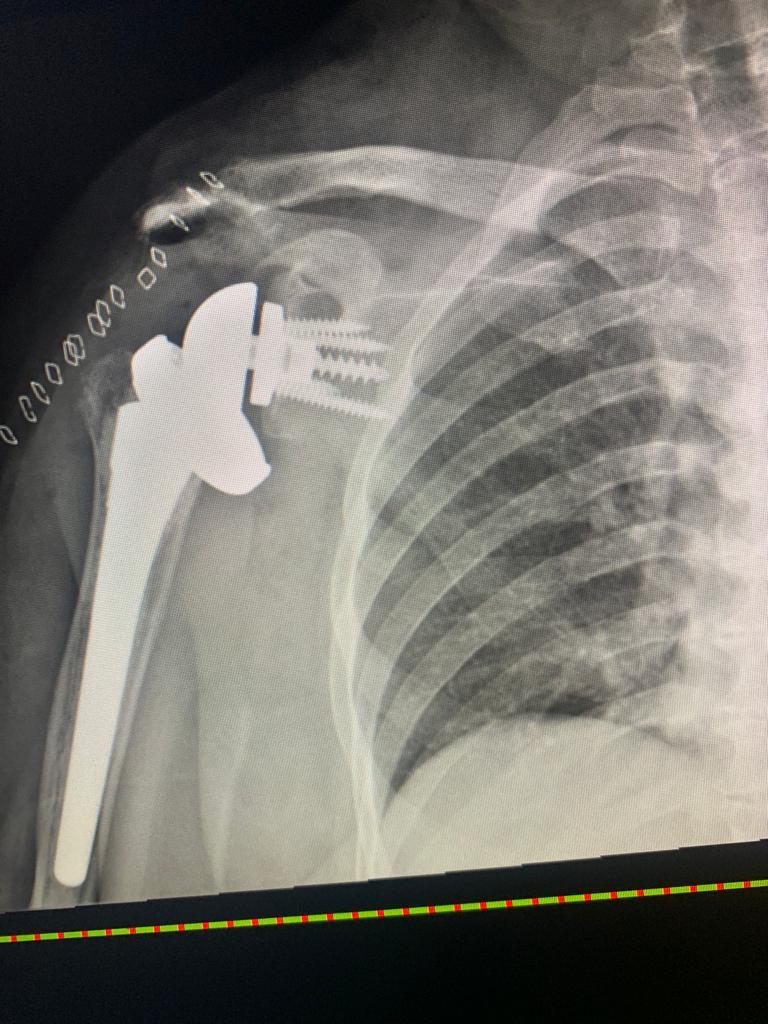 قرر بعدها الفريق الطبي إجراء عملية عبارة عن تركيب مفصل كتف صناعي معكوس و تعتبر من العمليات النادرة في هذا المجال واستغرقت قرابة الساعتين وبفضل من الله وتوفيقة تكللت العملية بنجاح وتمكنت المريضة من تحريك كتفها بشكل طبيعي وتخلصت من الآلام المبرحة التي كانت تلازمها وعودتها للممارسة حياتها طبيعية مع المتابعة مع قسم العلاج الطبيعي لاستكمال العلاج .