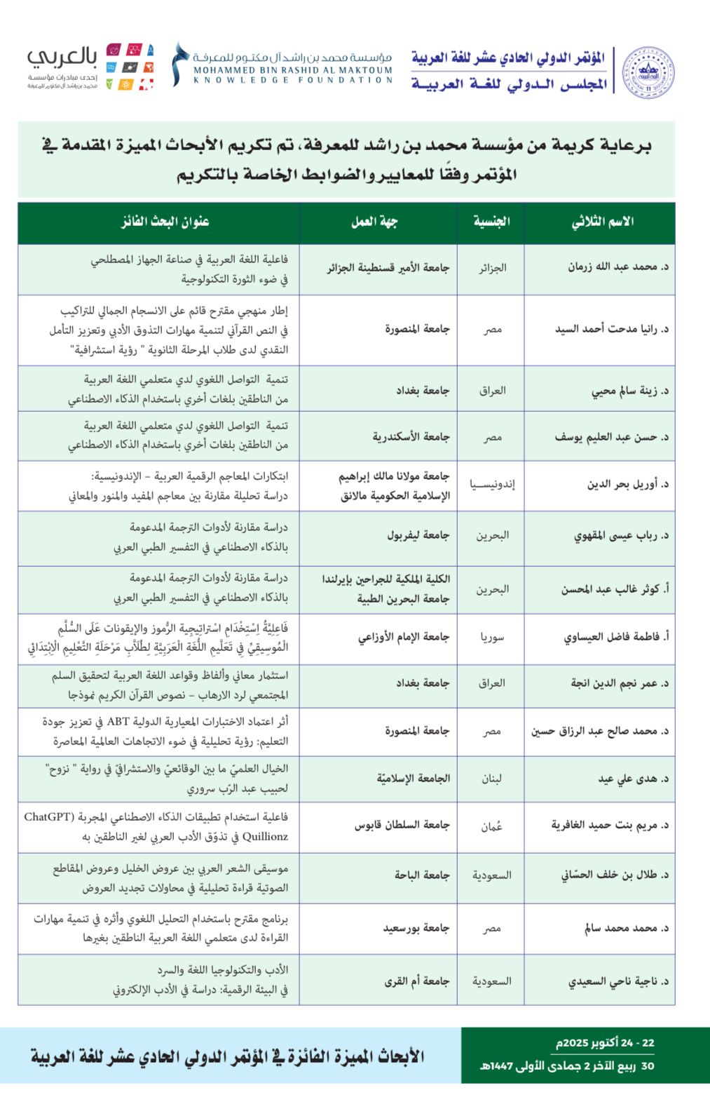 أعلن المؤتمر الدولي الحادي عشر للغة العربية عن الأبحاث العلمية الفائزة في المؤتمر والذي ترعاه مؤسسة محمد بن راشد للمعرفة في دبي حيث تم تكريم الأبحاث المميزة المقدمة في المؤتمر وفقا للمعايير والضوابط الخاصة بالتكريم .