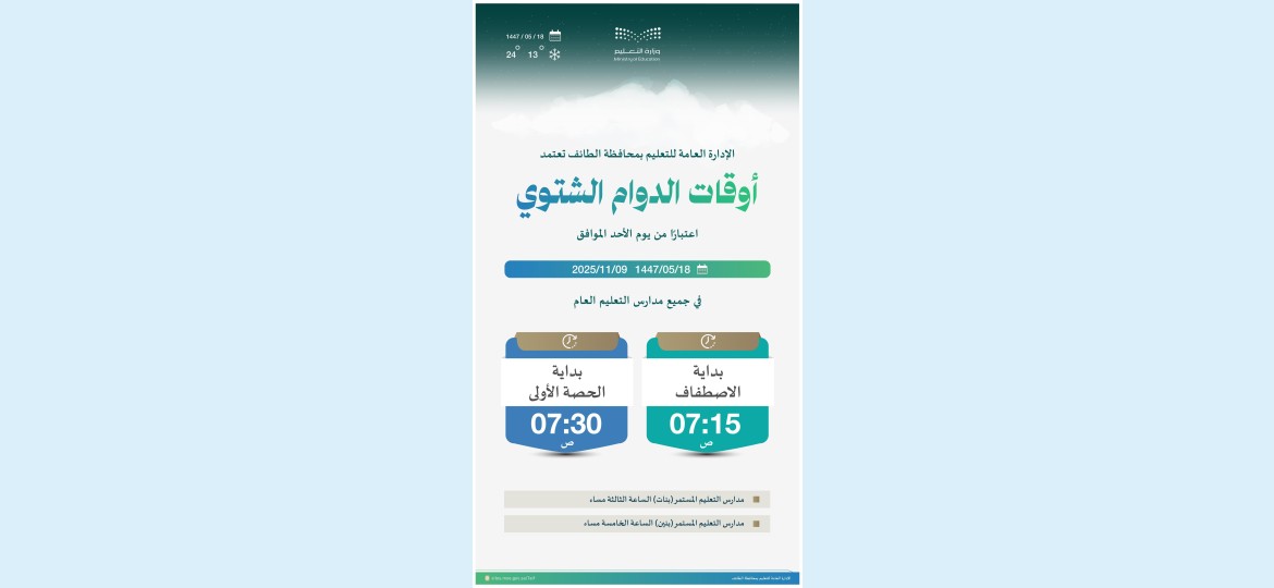 أقرت الإدارة العامة للتعليم بمحافظة الطائف موعد الدوام الشتوي للمدارس بجميع المراحل للبنين والبنات وذلك بدءًا من يوم الأحد المقبل الموافق 18 / 5 / 1447 هـ.