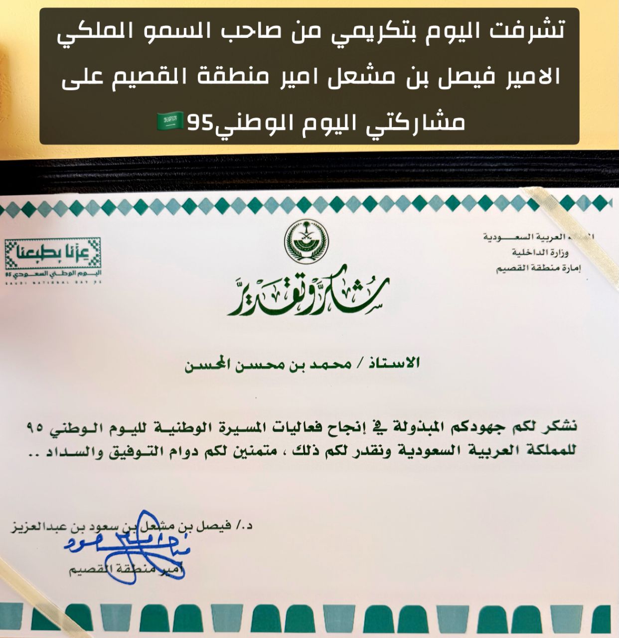 كرّم صاحب السمو الملكي الأمير فيصل بن مشعل بن سعود بن عبدالعزيز آل سعود، أمير منطقة القصيم، مصور صحيفة النهار السعودية تقديرًا لجهوده الإعلامية المتميزة وإسهاماته البارزة في توثيق المناسبات والفعاليات بالمنطقة.