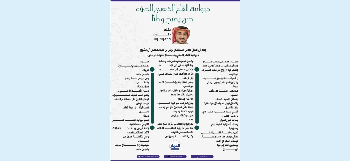 وهكذا، تغدو ديوانية القلم الذهبي أكثر من منصةٍ ثقافية، إنها نبضٌ من رؤية المملكة 2030، تكتبُ المستقبلَ بالحرف، وتبني للثقافة جسورًا من ضوء، حيث يكون الإبداعُ طريقًا، والوطنُ غاية.