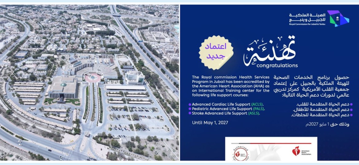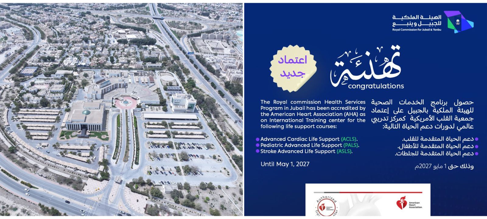 حصل برنامج الخدمات الصحية بالهيئة الملكية بالجبيل على اعتماد جمعية القلب الأمريكية (AHA) كمركز تدريبي عالمي معتمد لتنظيم وتنفيذ الدورات المتقدمة في دعم الحياة، وذلك عقب استيفاء كافة المتطلبات والمعايير العالمية والمعتمدة من قبل الجمعية، حيث يشمل الاعتماد الممنوح تنظيم وتقديم دورات دعم الحياة القلبية المتقدمة (ACLS)، ودعم الحياة المتقدمة للأطفال (PALS)، ودعم الحياة المتقدمة للجلطات الدماغية (ASLS)، مما يؤهل البرنامج ليصبح مركز تدريبي عالمي معتمد لتقديم هذه الدورات المعترف بها دوليًا للمدربين والمتدربين من مختلف التخصصات الطبية.